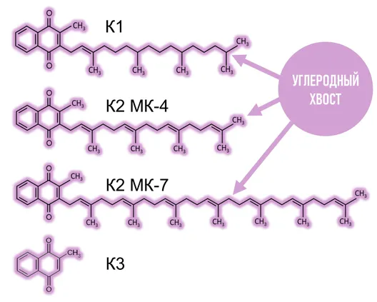 Все витамины К схожи по структуре, но витамин К2 МК-7 отличается большей длиной и степенью насыщенности углеродного "хвоста". Благодаря длинному "хвосту" К2 МК-7 циркулирует в крови и действует более длительно и значительно превосходит другие витамины К по влиянию на метаболизм.