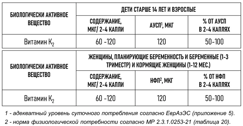 - 1 капля содержит 30 мкг витамина К2 МК-7.